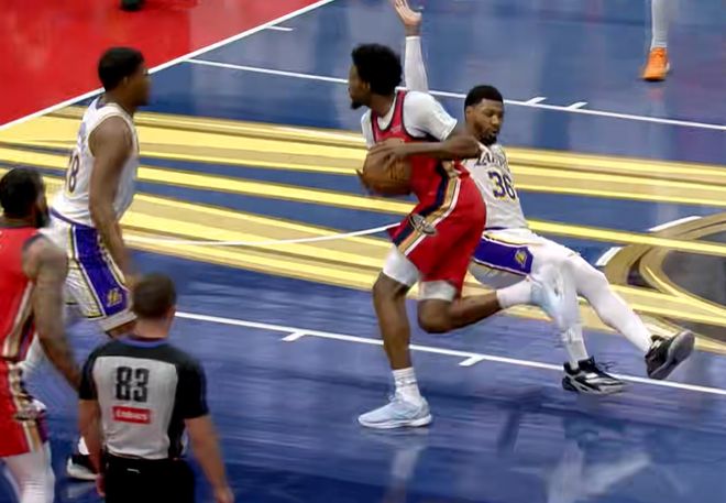 易边再战,里夫斯接发球直接长传,斯马特空接上篮湖人4秒完成进攻,东契奇连续运球单打,失去节奏高难度后仰跳投再中,湖人重新领先到15分。里夫斯突破顶开阿尔瓦拉多,滞空骑马射箭打进2+1,东契奇站定位置被撞到反而吹罚阻挡犯规,奎因转身上篮造成海斯犯规,湖人连续两次挑战成功,今天裁判真是抢戏了。有意思的是,此时镜头给到场边,鹈鹕主场落后21分,锡安替补席观战哈欠连天,看困了?